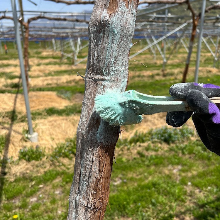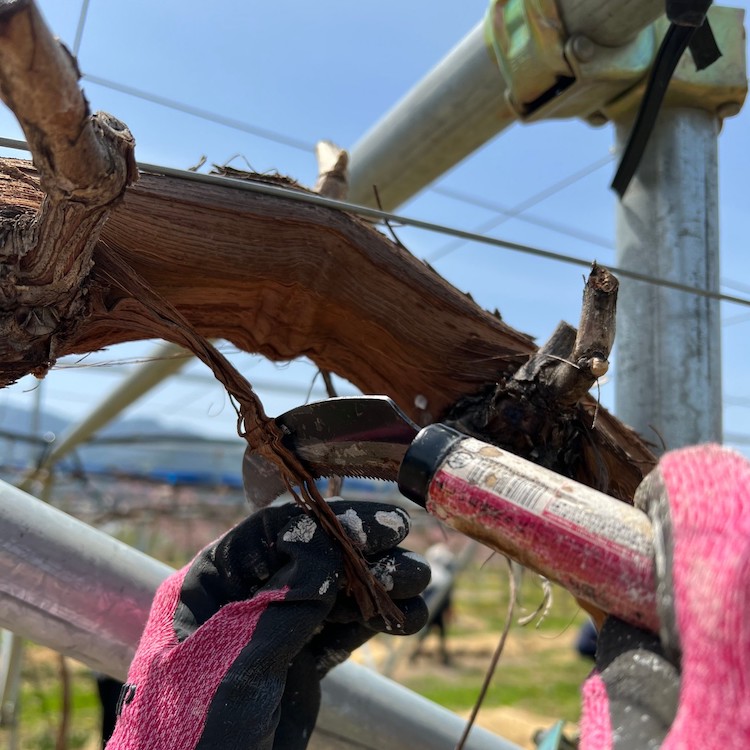 ぶどうの木と皮の間にいる虫の防虫、駆除が目的です。