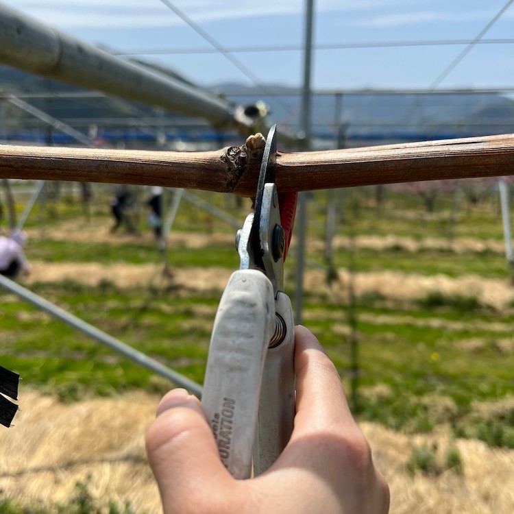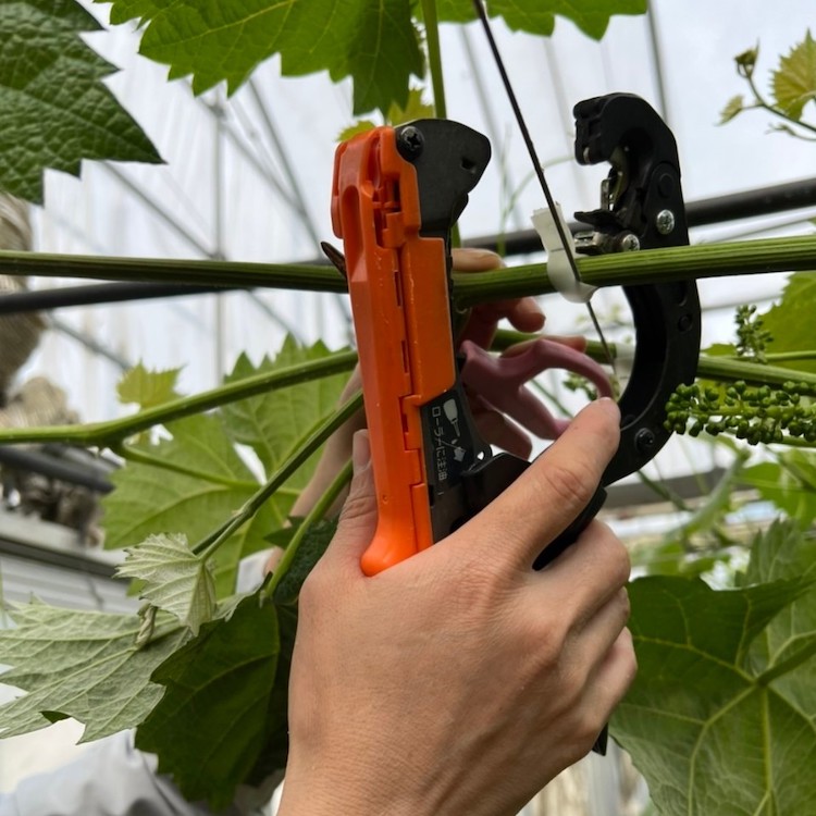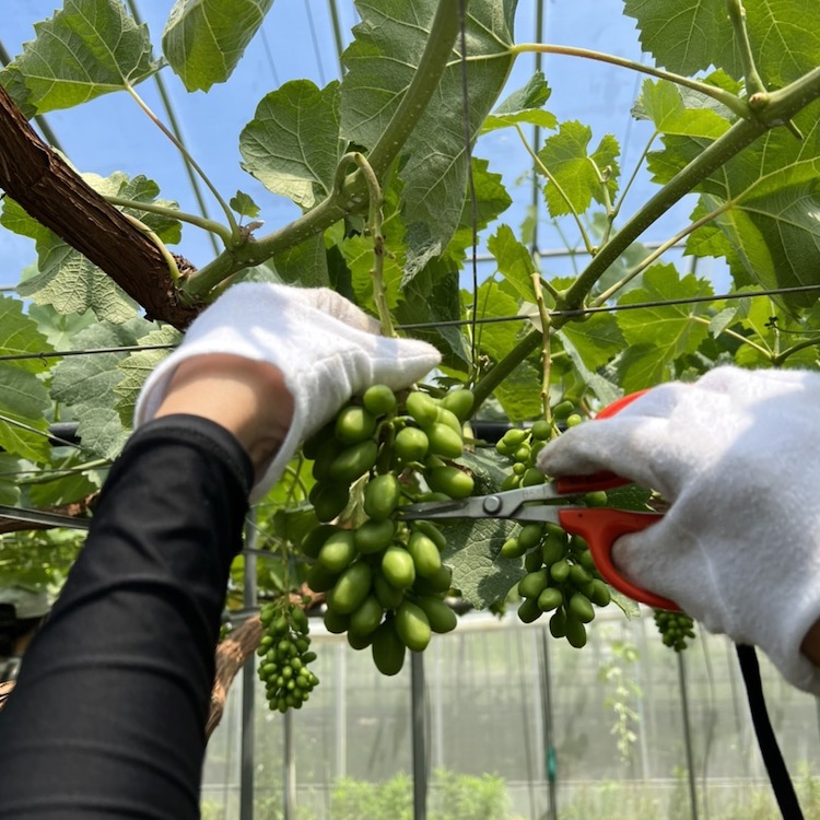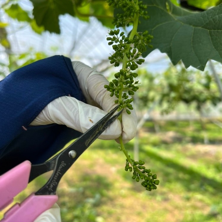 房切りで残したぶどうの粒を間引く作業を行います(25~30粒)。